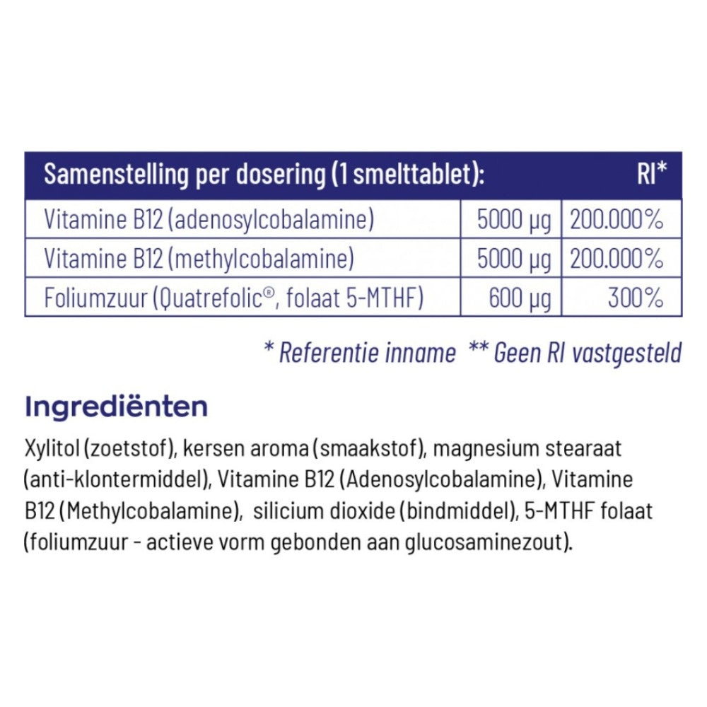 • Hoge dosering van 10.000 mcg B12 per smelttablet
