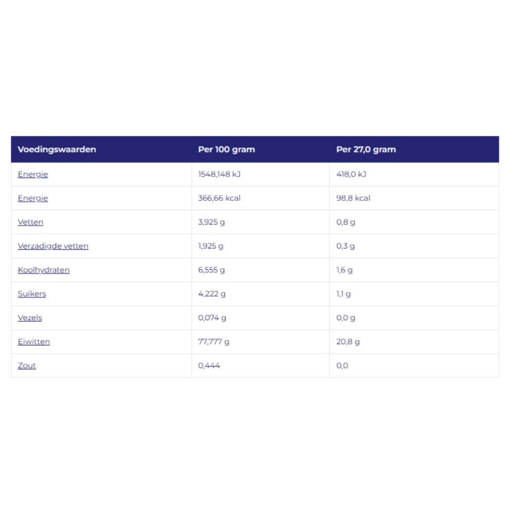 Wei-eiwit concentraat (melk), natuurlijk vanille aroma (smaakstof), xanthaan gom (verdikkingsmiddel), sucralose (zoetstof), silicium dioxide (anti-klontermiddel).