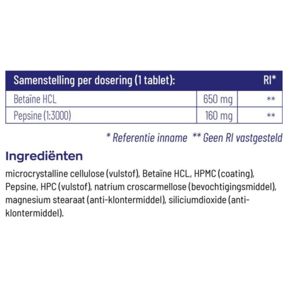 microcrystalline cellulose (bindmiddel), Betaïne HCL, HPMC (coating), Pepsine, HPC (vulstof), natrium croscarmellose (bevochtigingsmiddel), magnesium stearaat (anti-klontermiddel), siliciumdioxide (bindmiddel).