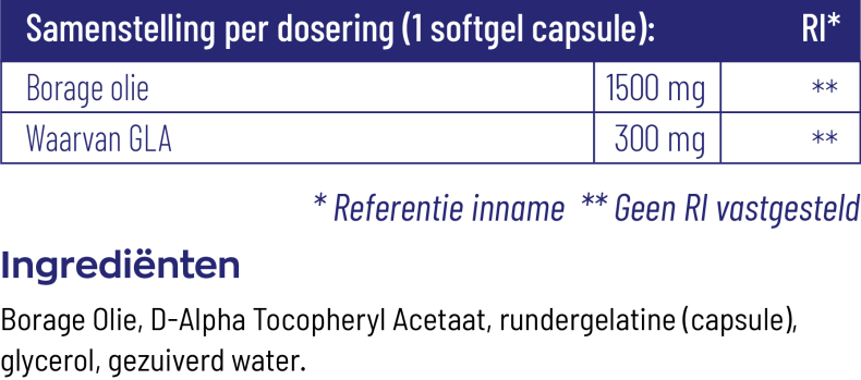 Borage Olie, D-Alpha Tocopheryl Acetaat, rundergelatine (capsule), glycerol, gezuiverd water.