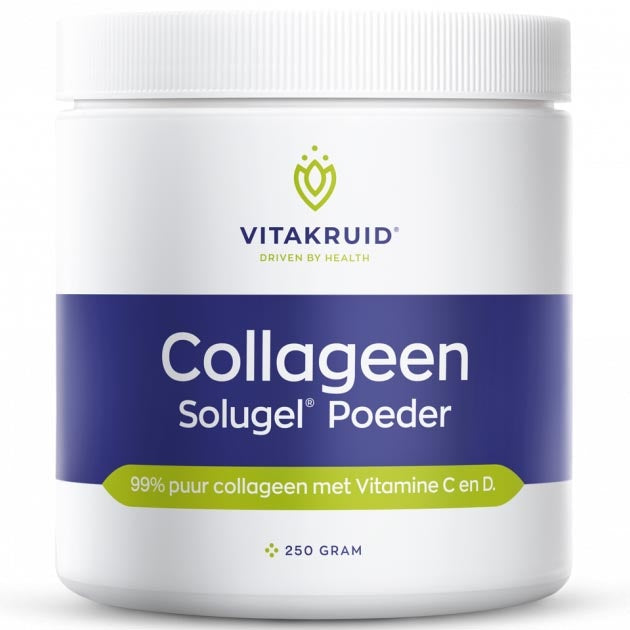 Vitakruid 99% Puur Collageen Solugel Poeder biedt ondersteuning bij de collageenproductie van het lichaam. Tot je 25e maakt het lichaam zelf collageen aan, daarna neemt de collageenproductie af. Collageen is één van de belangrijkste eiwitvormen van het lichaam. Het bevindt zich in verschillende soorten weefsels zoals pezen, kraakbeen, spieren en bloedvaten. Wanneer de collageenproductie afneemt, wordt de elasticiteit van de huid minder en worden fijne lijntjes en rimpels zichtbaar. Dit proces willen we vaak nog even uitstellen. Vitakruid 99% Puur Collageen Solugel Poeder kan hiervoor de uitkomst zijn!