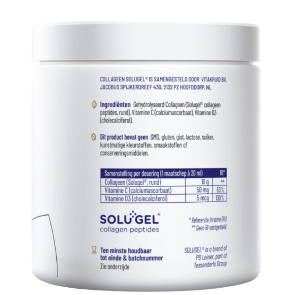 Collageen werkt goed samen met vitamine C. Vitamine C draagt namelijk bij aan de vorming van collageen. Voldoende collageen is van belang voor een gezonde huid. Het Vitakruid 99% Puur Collageen Solugel Poeder heeft ook een positief effect op het gebit en de botten door het toegevoegde vitamine C en vitamine D. Vitamine D zorgt namelijk voor een verhoogd calciumopname in de botten. Collageen is voornamelijk afkomstig van dierlijke producten zoals vis en rund. Rund is ook de basis voor het Collageen-supplement van Vitakruid. De collageen peptiden die worden gewonnen uit de dierlijke producten worden op molecuulniveau verkleind waardoor ze beter worden opgenomen door het lichaam. Eiwit is opgebouwd uit verschillende aminozuren. Het Vitakruid Collageen Solugel Poeder is een bron aan eiwitten. Het collageen poeder van Vitakruid is samengesteld met het beste aminozuurprofiel, zo bevat het 8 van de 9 essentiële aminozuren! Solugel blijkt uit onderzoek verschillende voordelen te hebben. Het is zuiver, bestaat voor 99% uit collageen en is daarnaast ook nog eens goed opneembaar.