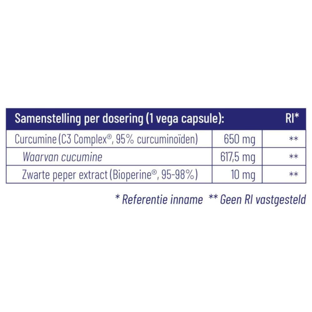 Curcumin C3 complex®, Bioperine®, Hypromellose (capsule), DiCalcium fosfaat (vulstof), silicium dioxide (vulstof), Magnesium stearaat (antiklontermiddel).
