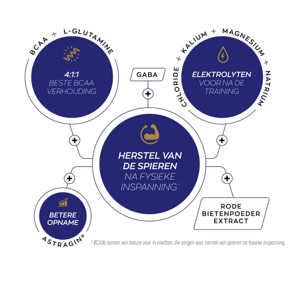 • BCAA’s (Leucine, Isoleucine, Valine) – Essentiële aminozuren voor sneller herstel