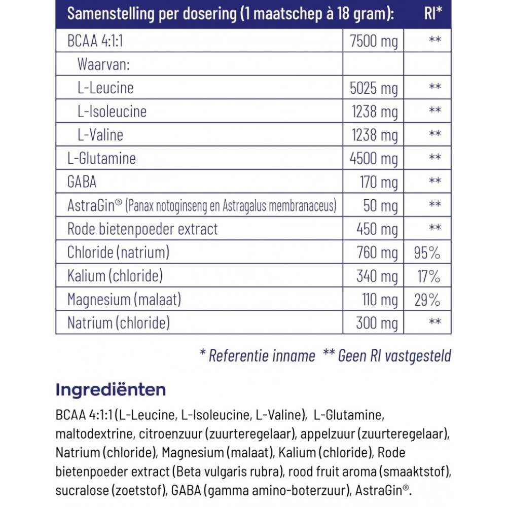 BCAA 4:1:1 (L-Leucine, L-Isoleucine, L-Valine), L-Glutamine, maltodextrine, citroenzuur (zuurteregelaar), appelzuur (zuurteregelaar), Natrium (chloride), Magnesium (malaat), Kalium (chloride), Rode bietenpoeder extract (beta vulgaris rubra), rood fruit aroma (smaaktstof), sucralose (zoetstof), GABA (gamma amino-boterzuur), AstraGin®.