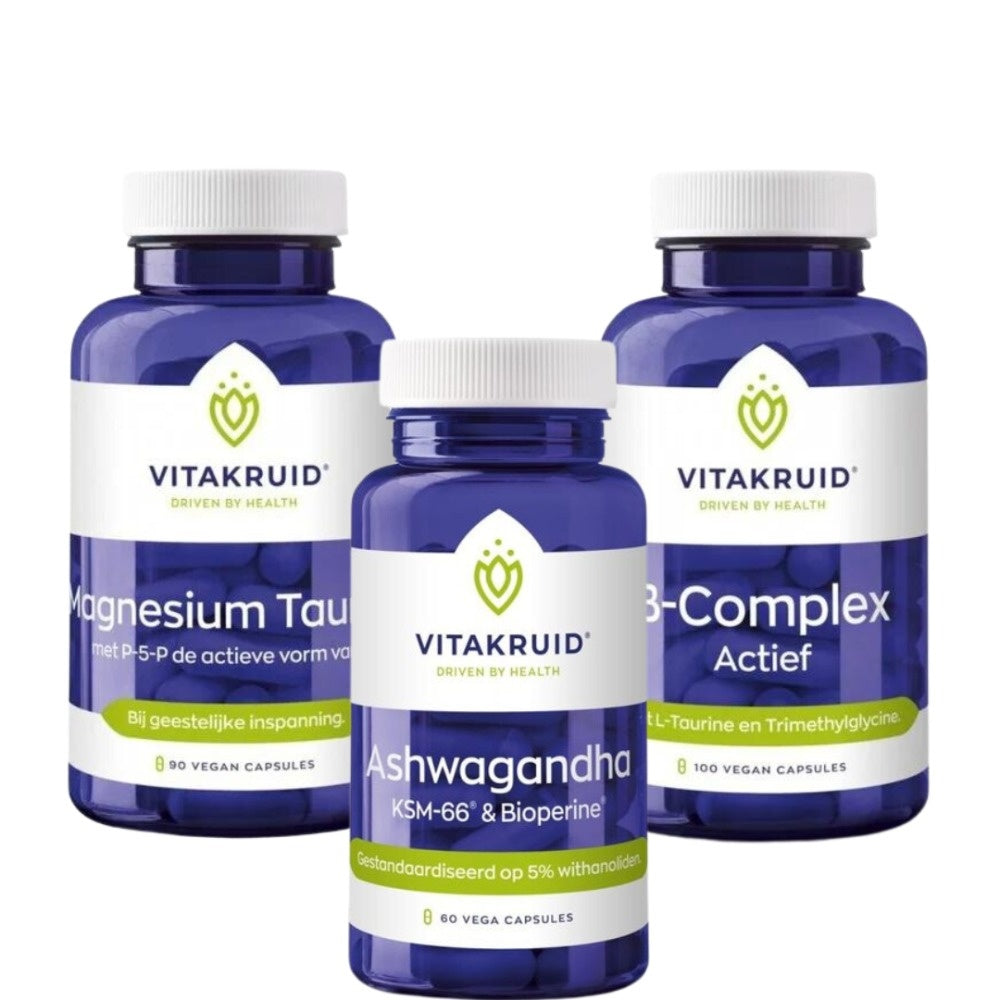Heb je een slecht humeur? Dat is niet alleen vervelend voor de mensen om je heen, maar ook voor jezelf. De Vitakruid Gemoedstoestand Bundel ondersteunt de gemoedstoestand. Ons humeur is namelijk afhankelijk van onze gemoedstoestand en onze mentale toestand is weer afhankelijk van de verschillende voedingsstoffen die we opnemen. Omdat onze mentale gezondheid minstens net zo belangrijk is als onze lichamelijke gezondheid heeft Vitakruid een Bundel ontwikkeld speciaal om jou weer te laten glimlachen. Ashwagandha draagt bij aan een goede geestelijke balans, het B-Complex actief is een energieformule met een ondersteunende rol voor de gemoedstoestand en het veelzijdige Magnesium Tauraat heeft een positief effect op de hersenfunctie, zenuwstelsel en draagt uiteraard ook bij aan de gemoedstoestand.  Dankzij deze drie voedingssupplementen in combinatie met een gezonde levensstijl zit jij hopelijk snel weer wat beter in je vel!