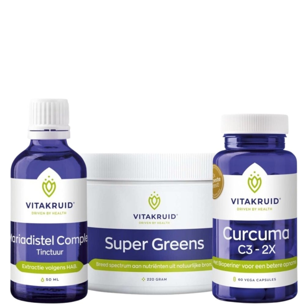 Vitakruid Lever Detox Bundel ondersteunt de gezondheid van de lever. Je zou misschien niet zo snel aan de gezondheid van je lever denken, maar ons lever krijgt dagelijks heel wat te voortduren. Een slecht ritme, ongezonde voeding of toch dat ene feestje hebben direct invloed op de gezondheid van onze lever. Om je lever te ondersteunen is het Mariadistel Complex aan te raden. De drie kruiden in deze formule werken perfect samen en vullen elkaar aan daar waar nodig. Daarnaast zorgt Super Greens ervoor dat ook de gal en nierfunctie worden ondersteund. Het Curcuma C3-2X werkt als antioxidant en stimuleert de vertering. Alles wat je nodig hebt voor het ondersteunen van je lever in één keer in huis dankzij deze gemakkelijke én voordelige bundel!
