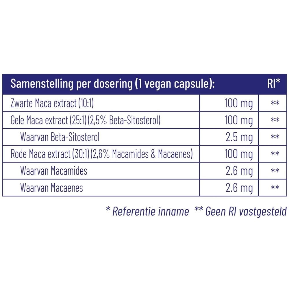 Zwarte maca extract (Lepidium meyenii), Gele maca extract (Lepidium meyenii), Rode maca extract (Lepidium meyenii), HPMC (capsule), microcrystalline cellulose (vulstof), magnesiumzouten van natuurlijke vetzuren (anti-klontermiddel), silicium dioxide (anti-klontermiddel).