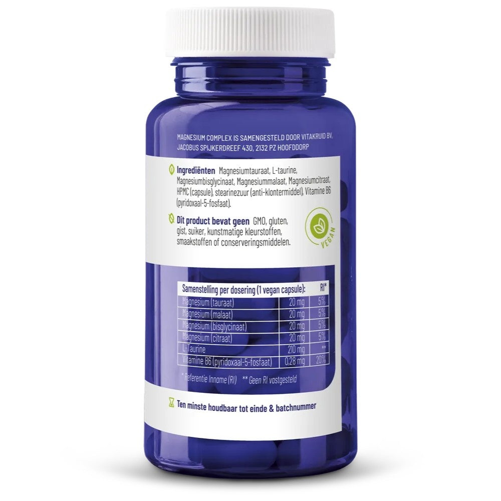 Het Magnesium Complex van Vitakruid bestaat uit vier verschillende vormen van Magnesium: magnesium bisglycinaat, magnesium malaat, magnesium tauraat en magnesium citraat. Deze verschillende vormen van magnesium werken hand in hand samen waardoor je profiteert van zo veel mogelijk gezondheidsvoordelen. Daarnaast is het Magnesium Supplement ook beter opneembaar. Daarnaast bevat het Magnesium Supplement van Vitakruid ook L-Taurine. L-Taurine is een zwavelhoudend aminozuur dat van nature voorkomt in het lichaam, het speelt een essentiële rol bij verschillende fysiologische processen. Zo draagt L-Taurine bij aan een gezond zenuwstelsel, gezonde spieren, goede bloeddruk en ondersteunt het de functie van het lever. Daarnaast is vitamine B6 (toegevoegd in de vorm van P-5-P) belangrijk voor de opbouw en afbraak van aminozuren. Vitamine B6 werkt dus goed samen met L-Taurine. Daarnaast heeft vitamine B6 een positieve werking op de stofwisseling, de bloedaanmaak en het immuunsysteem.
