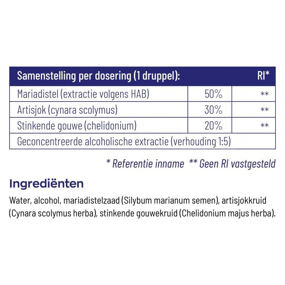 Water, alcohol, mariadistelzaad (Silybum marianum semen), artisjokkruid (Cynara scolymus herba), stinkende gouwekruid (Chelidonium majus herba).