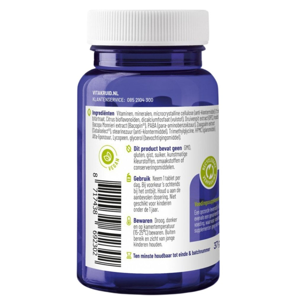 Vitaminen, mineralen, microcrystalline cellulose (anti-klontermiddel), Choline bitartraat, Citrus bïoflavonoiden, dicalciumfosfaat (vulstof), Druivenpit extract (OPC), Inositol, Bacopa Monnieri extract (Bacopin®), PABA (para-aminobenzoëzuur), Zaagpalm extract (Sabalselect®), stearinezuur (anti-klontermiddel), Trimethylglycine, HPMC (glansmiddel), Alfa-liponzuur, Lycopeen, glycerol (bevochtigingsmiddel).