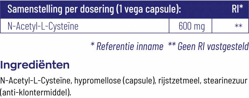 N-Acetyl-L-Cysteïne, hypromellose (capsule), rijstzetmeel, stearinezuur (anti-klontermiddel).