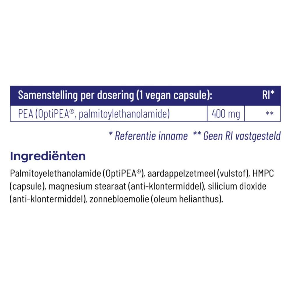 Palmitoyelethanolamide (OptiPEA®), aardappelzetmeel (vulstof), HMPC (capsule), magnesium stearaat (anti-klontermiddel), silicium dioxide (anti-klontermiddel), zonnebloemolie (oleum helianthus).