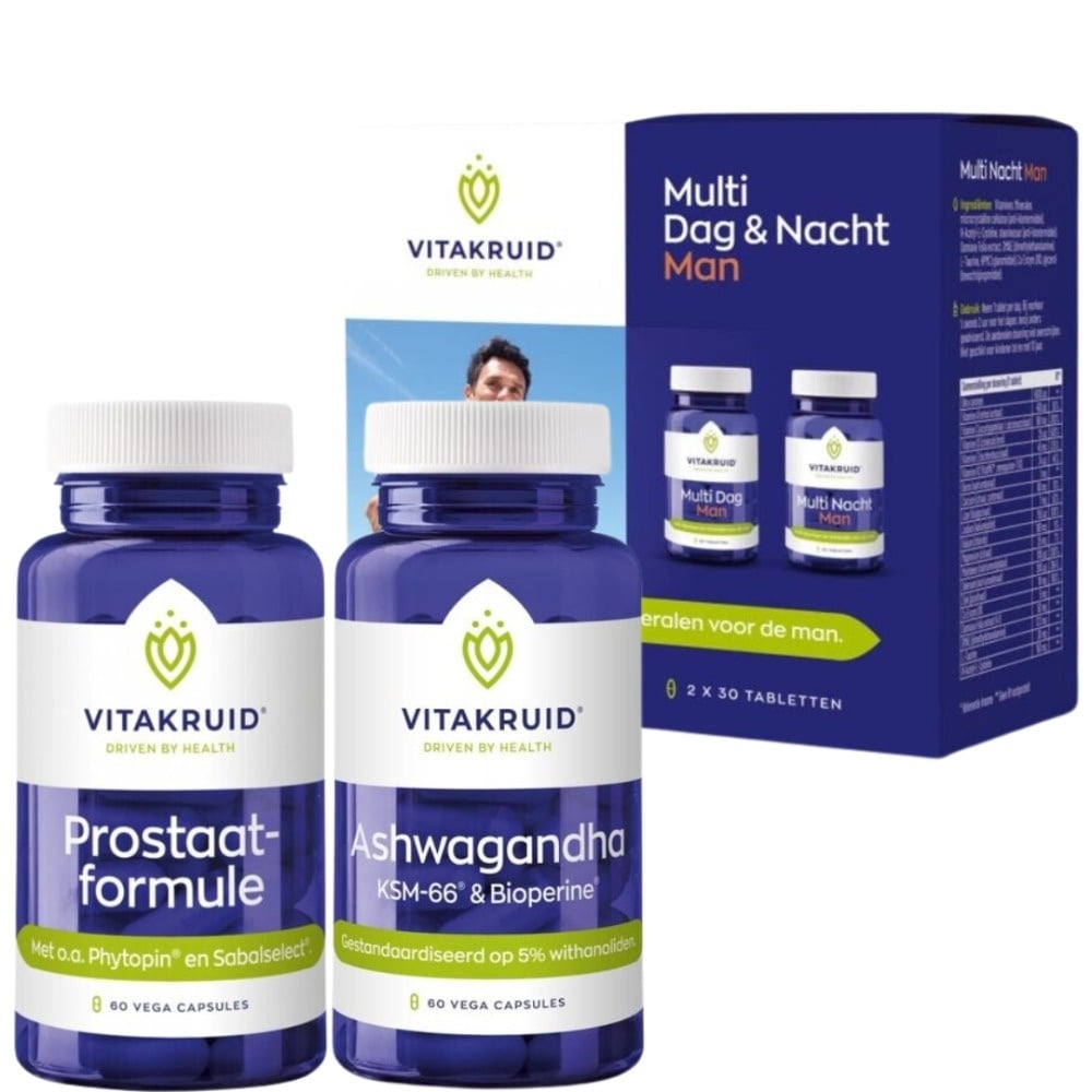 Vitakruid Prostaat, Vruchtbaarheid en Seksualiteit Bundel is dé bundel voor het ondersteunen van de speerpunten in het mannelijke bestaan. De prostaatgezondheid, vruchtbaarheid en seksualiteit zijn belangrijke onderdelen in het leven. We willen dan natuurlijk deze punten de ondersteuning bieden die ze nodig hebben. Om deze reden heeft Vitakruid een bundel gemaakt met drie voedingssupplementen die deze pijlers helpen te ondersteunen en de gezondheid bevorderen. Allereerst natuurlijk de prostaatformule, deze formule van Vitakruid is het beste prostaatproduct van Nederland! Het complete product bestaat uit een wetenschappelijk onderbouwde mix van vitamines, mineralen, aminozuren en zaagpalm SabalSelect. De formule helpt onder andere bij het goed blijven plassen. Ashwagandha ondersteunt de mannelijke potentie en de multi heeft meerdere gezondheidsvoordelen speciaal gericht op de behoefte van de man. Geef je gezondheid (en mannelijkheid) een boost!