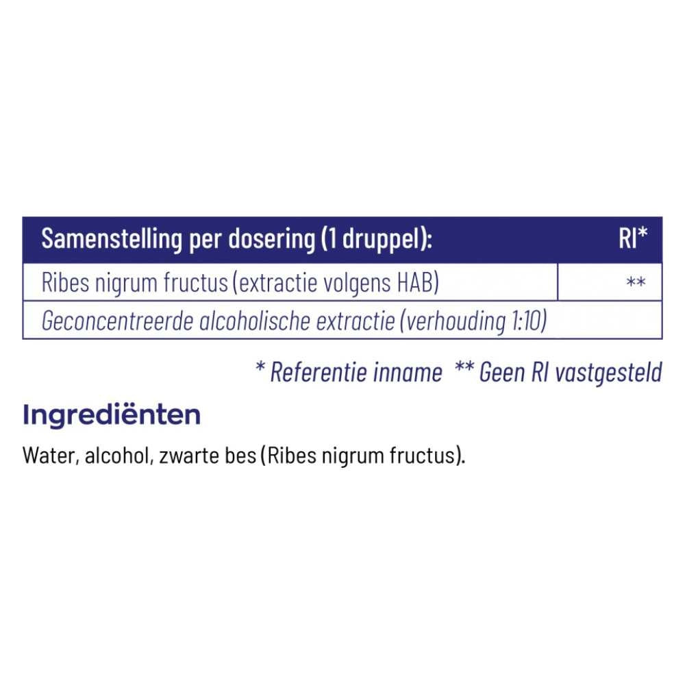 Water, alcohol, zwarte bes (Ribes nigrum fructus) (13mg droog extract).