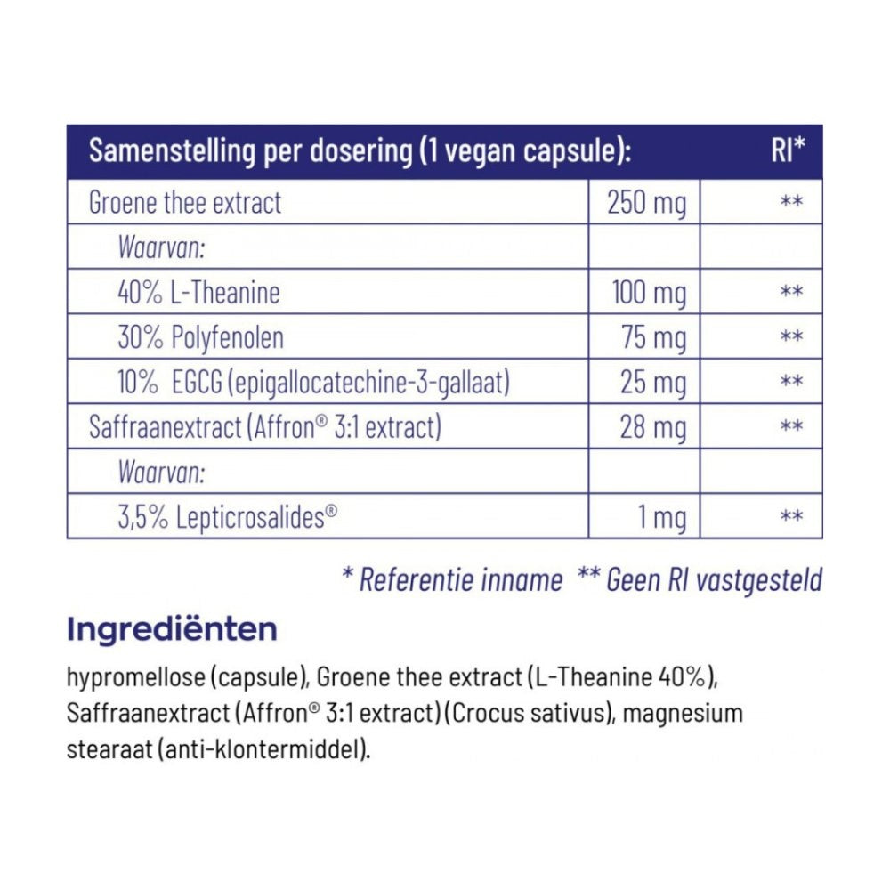 hypromellose (capsule), Groene thee extract (L-Theanine 40%), Saffraanextract (Affron® 3:1 extract) (Crocus sativus), magnesium stearaat (anti-klontermiddel).