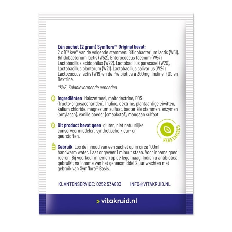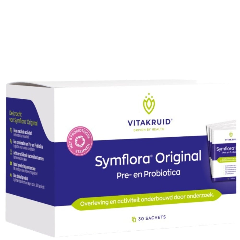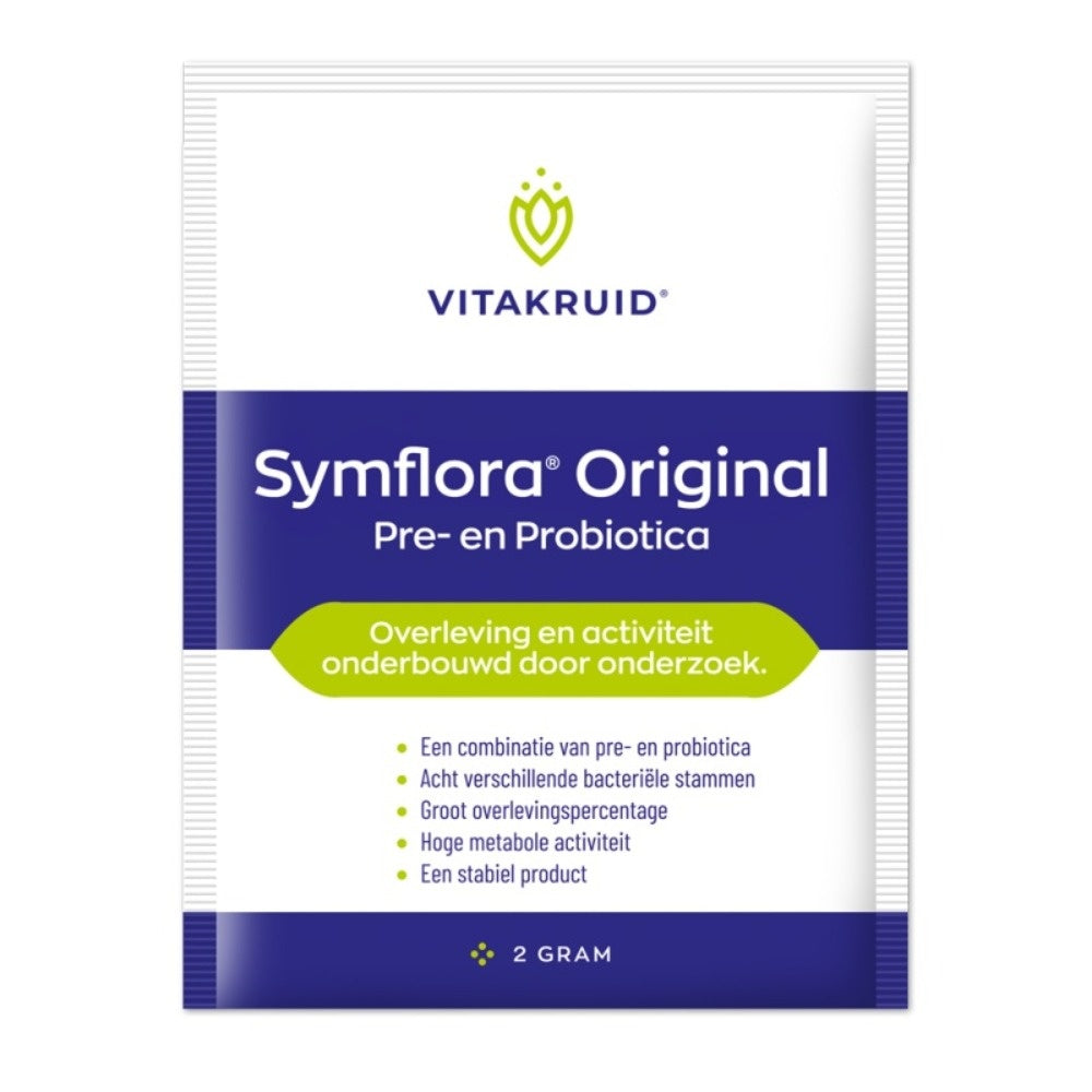 De Vitakruid Symflora® Original is een complete pre- en probiotica formule. De formule bevat maar liefst acht verschillende bacteriestammen gecombineerd omdat dit volgens wetenschappelijk onderzoek de meest effectieve manier is. De prebiotica in de formule functioneert als bodem voor de probiotica. Dankzij deze vezels wordt de groei van bacteriën bevorderd waardoor er een hogere overlevingskans is en metabole activiteit.