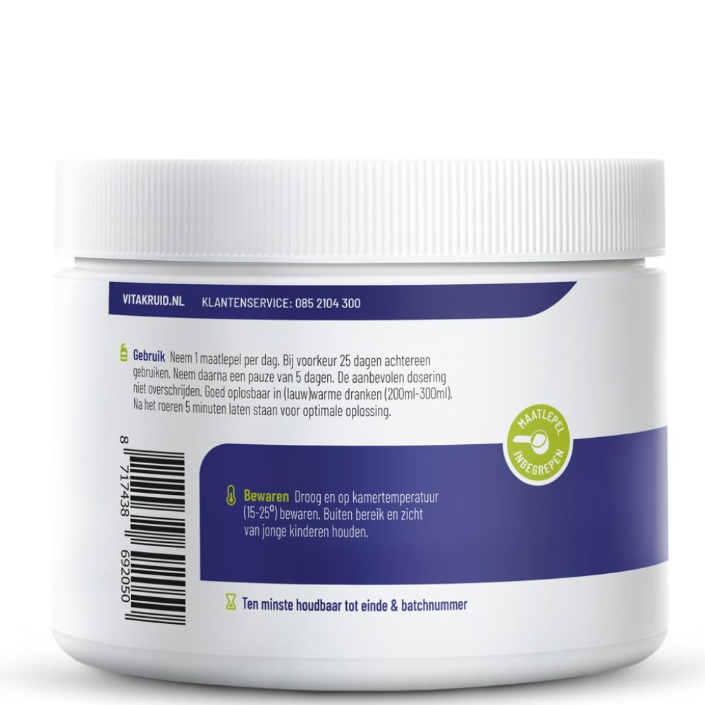 Vitakruid 99% Puur Viscollageen is zeer geschikt voor het behouden van een stevige en elastische huid. Voor ons lichaam is collageen een belangrijke eiwitvorm. Collageen bevat maar liefst 30% van onze totale eiwitten! Het eiwit vind je in allerlei soorten weefsels in je lichaam zoals huid, spieren, bloedvaten, kraakbeen en pezen. Tot je 25e maak je zelf collageen aan daarna neemt deze aanmaak af en is het dus niet gek om het lichaam te helpen door wat extra collageen in te nemen. Wanneer de aanmaak van collageen afneemt worden namelijk de eerste tekenen van veroudering zichtbaar en dat willen we natuurlijk graag nog even uitstellen!