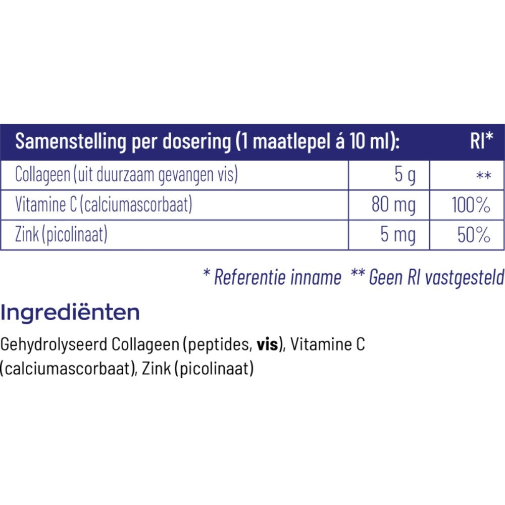 Gehydrolyseerd Collageen (peptides, vis), Vitamine C (calciumascorbaat), Zink (picolinaat)