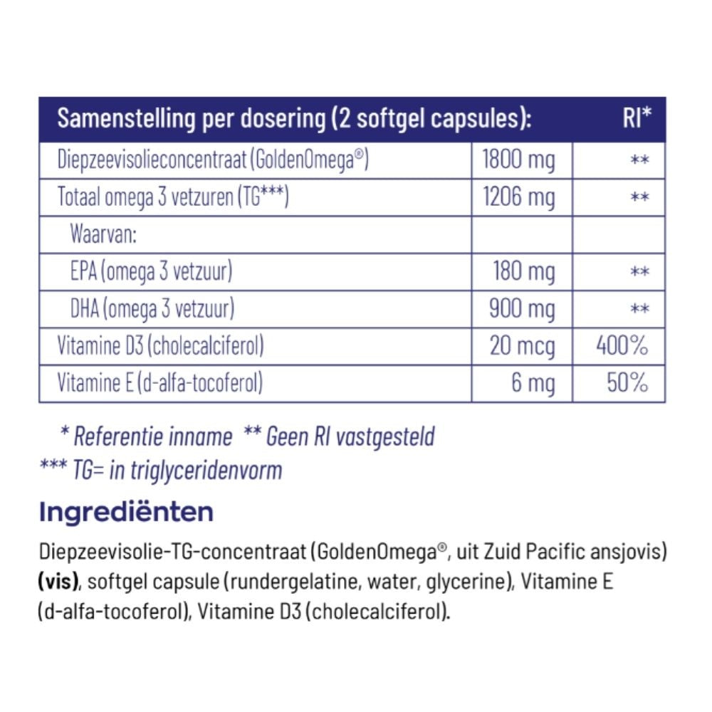Ingrediënten: Diepzeevisolietg-concentraat (GoldenOmega®, uit Zuid Pacific ansjovis) (vis), softgel capsule (rundergelatine, water, glycerine), Vitamine E (d-alfa-tocoferol), Vitamine D3 (cholecalciferol).
