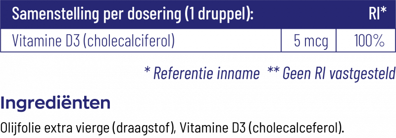 Olijfolie extra vierge (draagstof), Vitamine D3 (cholecalciferol).