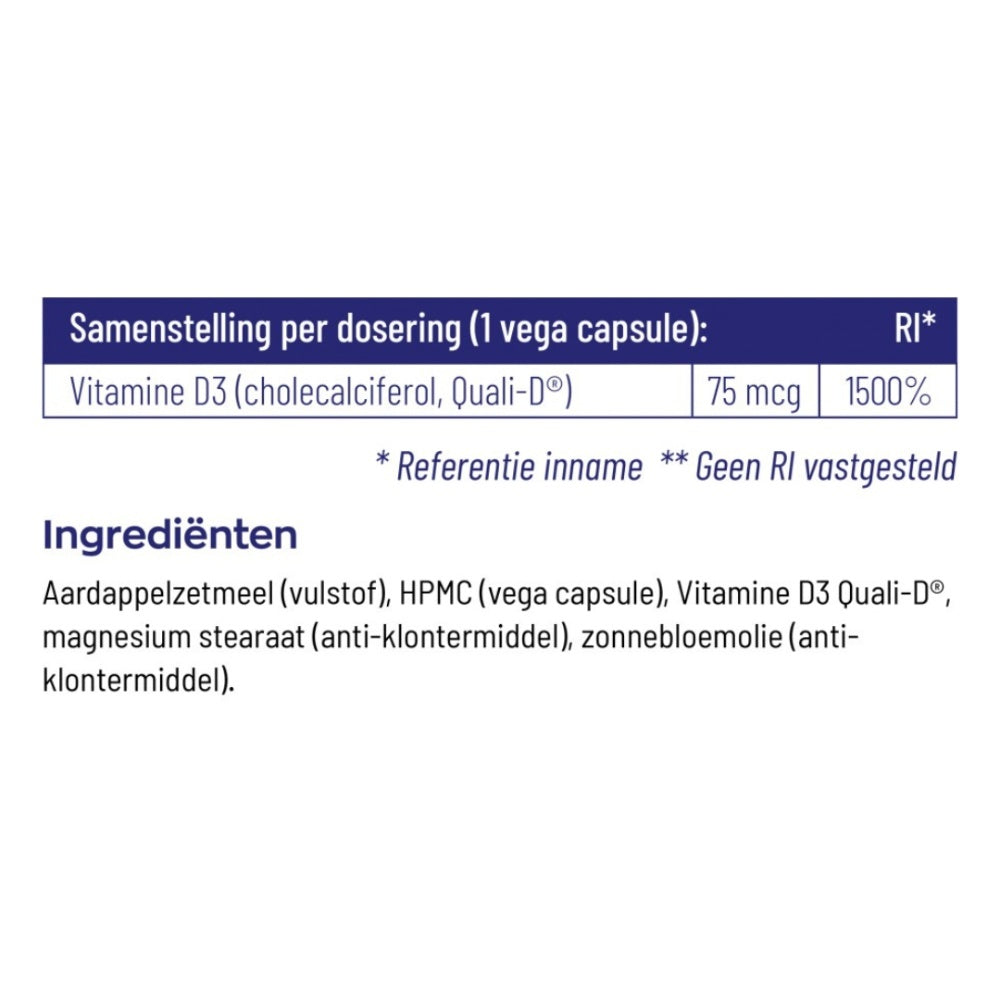 aardappelzetmeel (vulstof), HPMC (capsule), Vitamine D3 (cholecalciferol, Quali-D®), magnesium stearaat (anti-klontermiddel), zonnebloemolie (helianthus annuus).