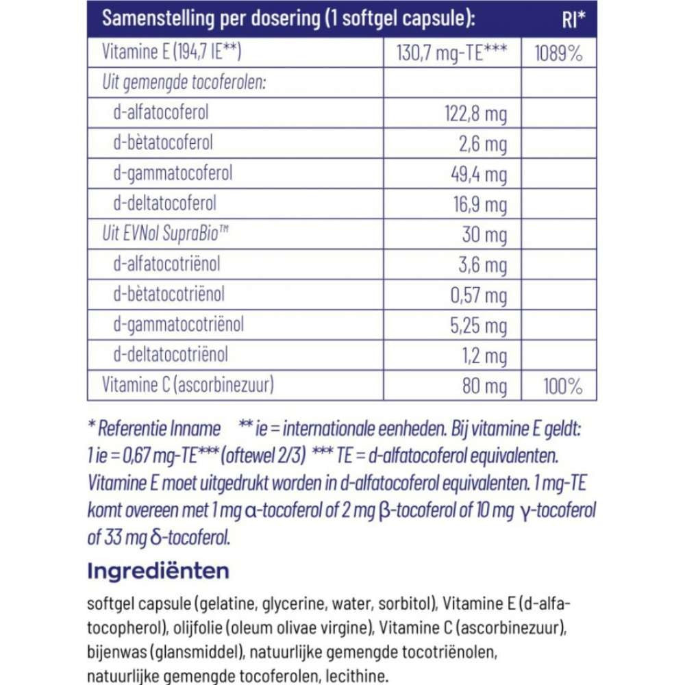 softgel capsule (gelatine, glycerine, water, sorbitol), vitamine E (d-alfa-tocopherol), olijfolie (oleum olivae virgine), vitamine C (ascorbinezuur), bijenwas (glansmiddel), natuurlijke gemengde tocotriënolen, natuurlijke gemengde tocoferolen, lecithine.