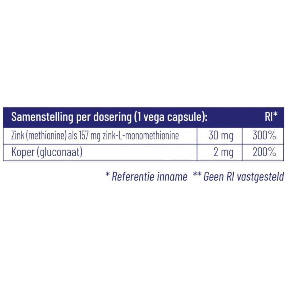 Aardappelzetmeel (vulstof), Zink L-monomethionine, Vegetarische HPMC capsule, Kopergluconaat, Zonnebloemolie (anti klontermiddel), Magnesiumstearaat (anti klontermiddel).