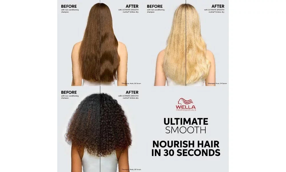 Wella Professionals Ultimate Smooth Complete Set efterlader dit hår intenst næret, silkeblødt og krusfrit. Dine lokker får en sund glans og føles vidunderligt glatte. Desuden beskyttes dit hår mod varme og UV-stråling, så det holder sig sundt og strålende i længere tid.