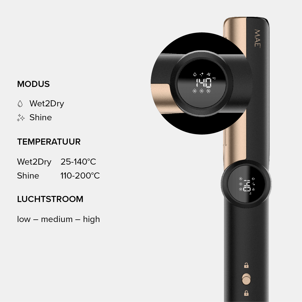• Wet2Dry Mode: Temperatuur van 25, 80, 110, 140°C voor nat haar