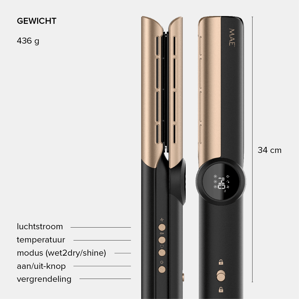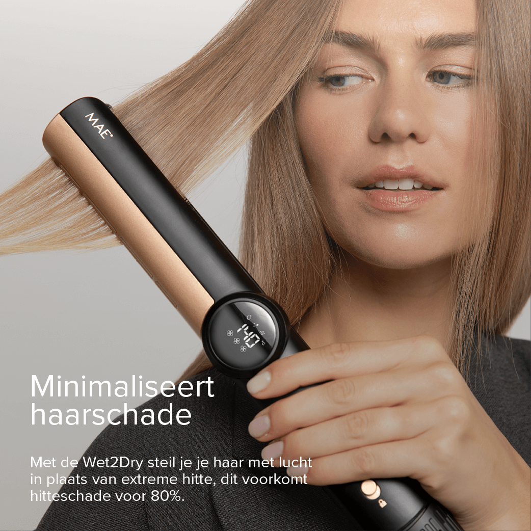 De MAE Wet2Dry zorgt voor zijdezacht, steil en glanzend haar met 80% minder hitteschade dan traditionele stijltangen. Dankzij de iontechnologie wordt pluis verminderd en wordt je haar beschermd tegen uitdroging. Je krijgt een professioneel resultaat zonder het lange föhnen en steilen dat je gewend bent.