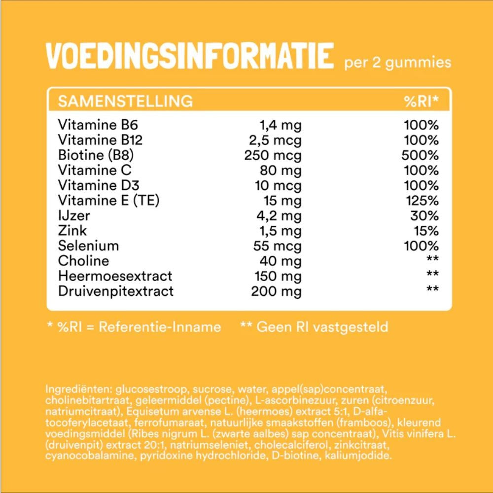 Ingrediënten: Glucosestroop, sucrose, water, appelsapconcentraat, cholinebitartraat, pectine, L-ascorbinezuur (vitamine C), citroenzuur, natriumcitraat, heermoesextract 5:1, D-alfa-tocoferylacetaat (vitamine E), ferrofumaraat (ijzer), natuurlijke smaakstoffen (framboos), kleurend voedingsmiddel (zwarte aalbes concentraat), druivenpitextract 20:1, natriumseleniet, cholecalciferol (vitamine D3), zinkcitraat, cyanocobalamine (vitamine B12), pyridoxinehydrochloride (vitamine B6), D-biotine (vitamine B8), kaliumjodide.